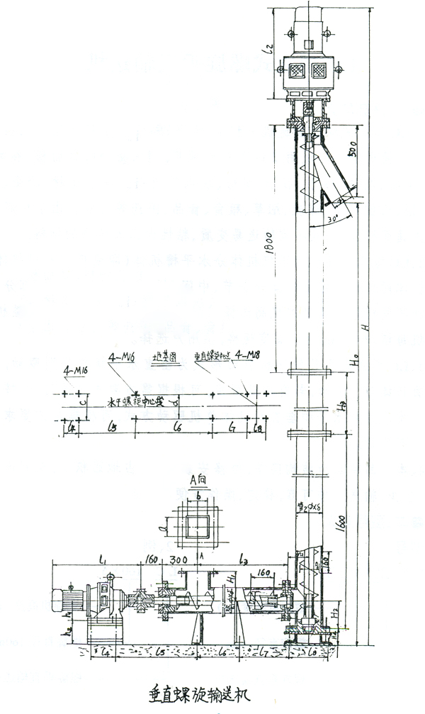 2、LC型立式螺旋輸送機(jī)分水平槽機(jī)體(即喂料螺旋槽機(jī)體)垂直機(jī)體兩部分。垂直機(jī)體分頭節(jié)、中間節(jié)、尾節(jié)三部分,每一部分又有集中不同規(guī)格的長(zhǎng)度依機(jī)高選擇,可組成3~15m不同高度的整機(jī),螺旋機(jī)每增加0.5m為一高度規(guī)格,供用戶選擇。